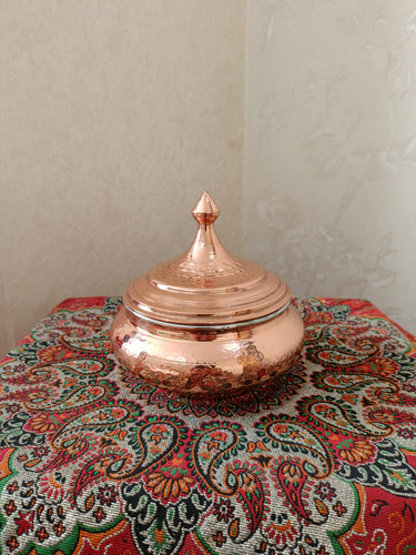 قندان مسی با طراحی لیزری طرح کلاسیک (بدون پایه) مناسب برای مصرف قند، تنقلات و میوه خشک دست ساز زنجان با قلع کاری داخل و روکش نانوناموجود