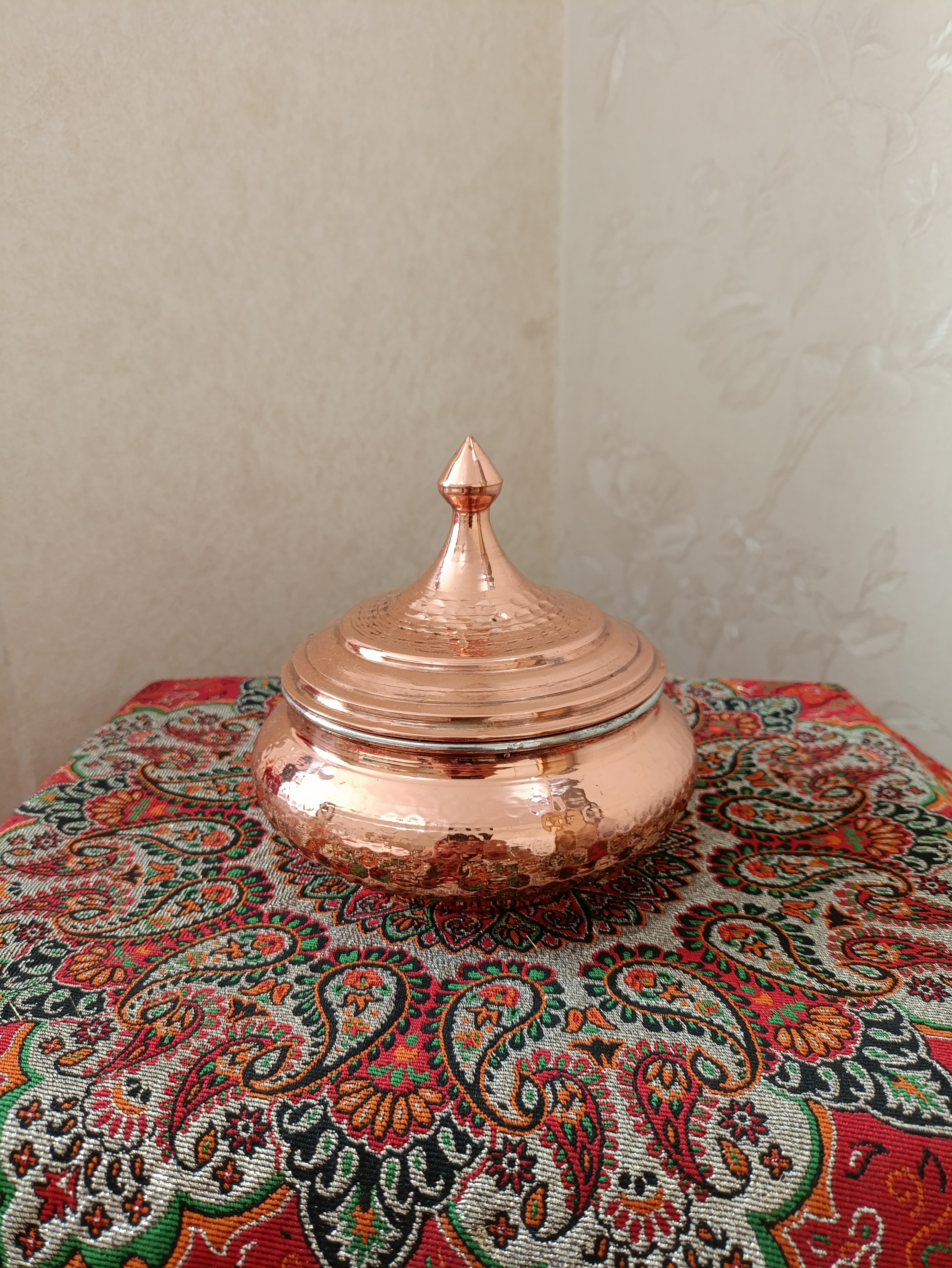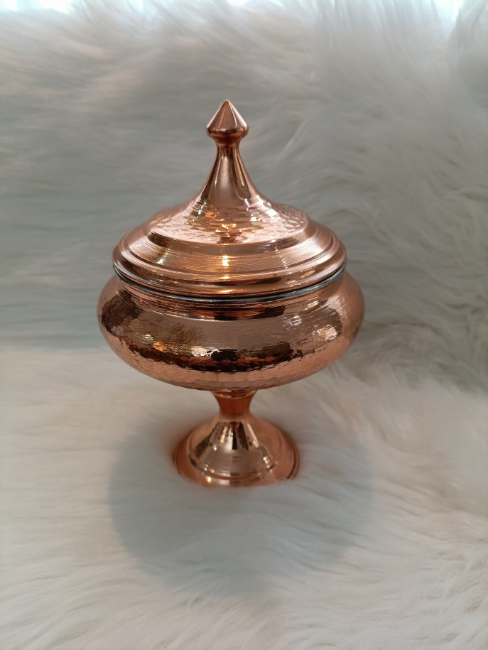 قندان مسی چکشی طرح گنبدی پایه دار مناسب برای مصرف قند، تنقلات و میوه خشک دست ساز زنجان با قلع کاری داخل و روکش نانو