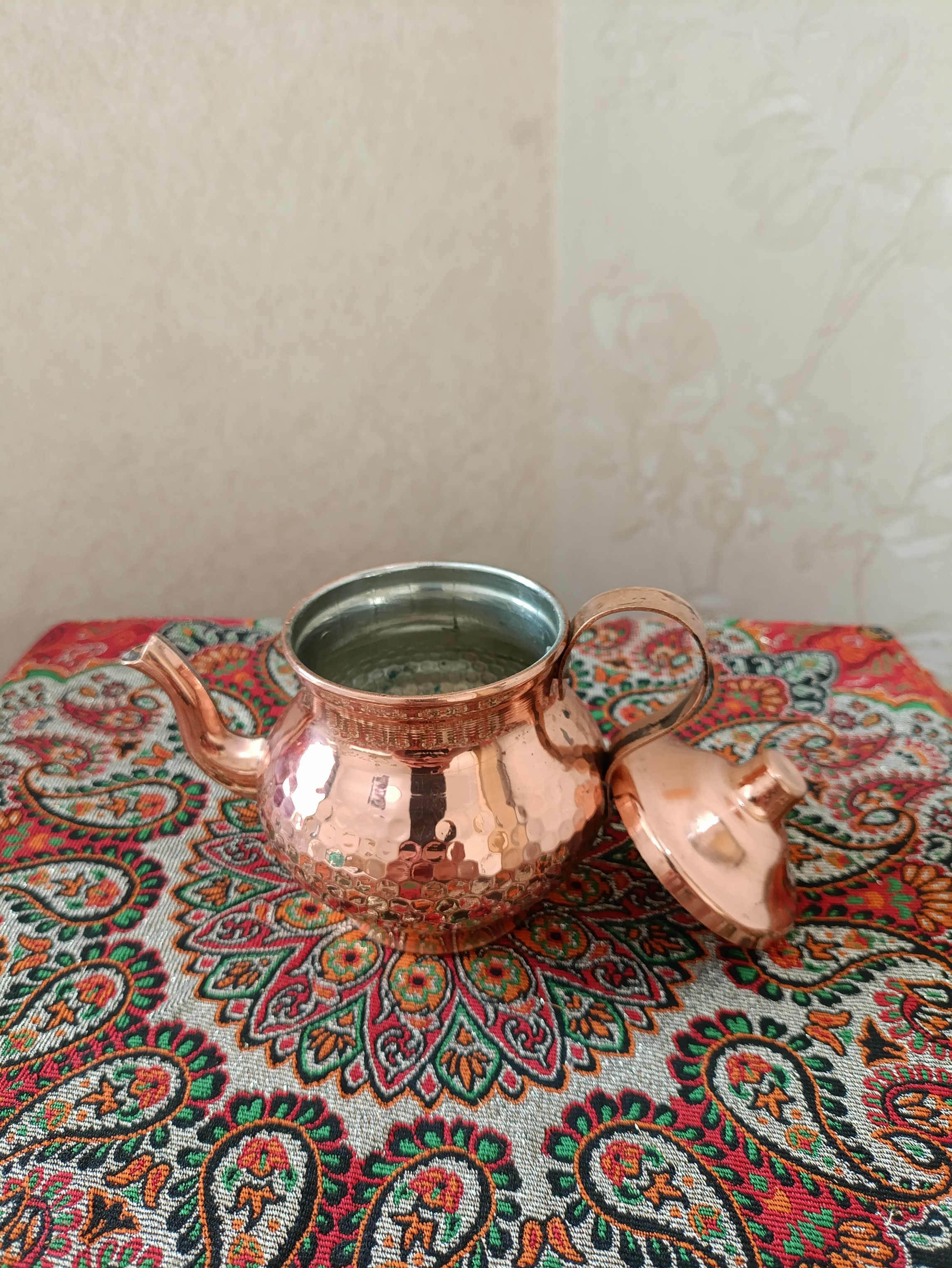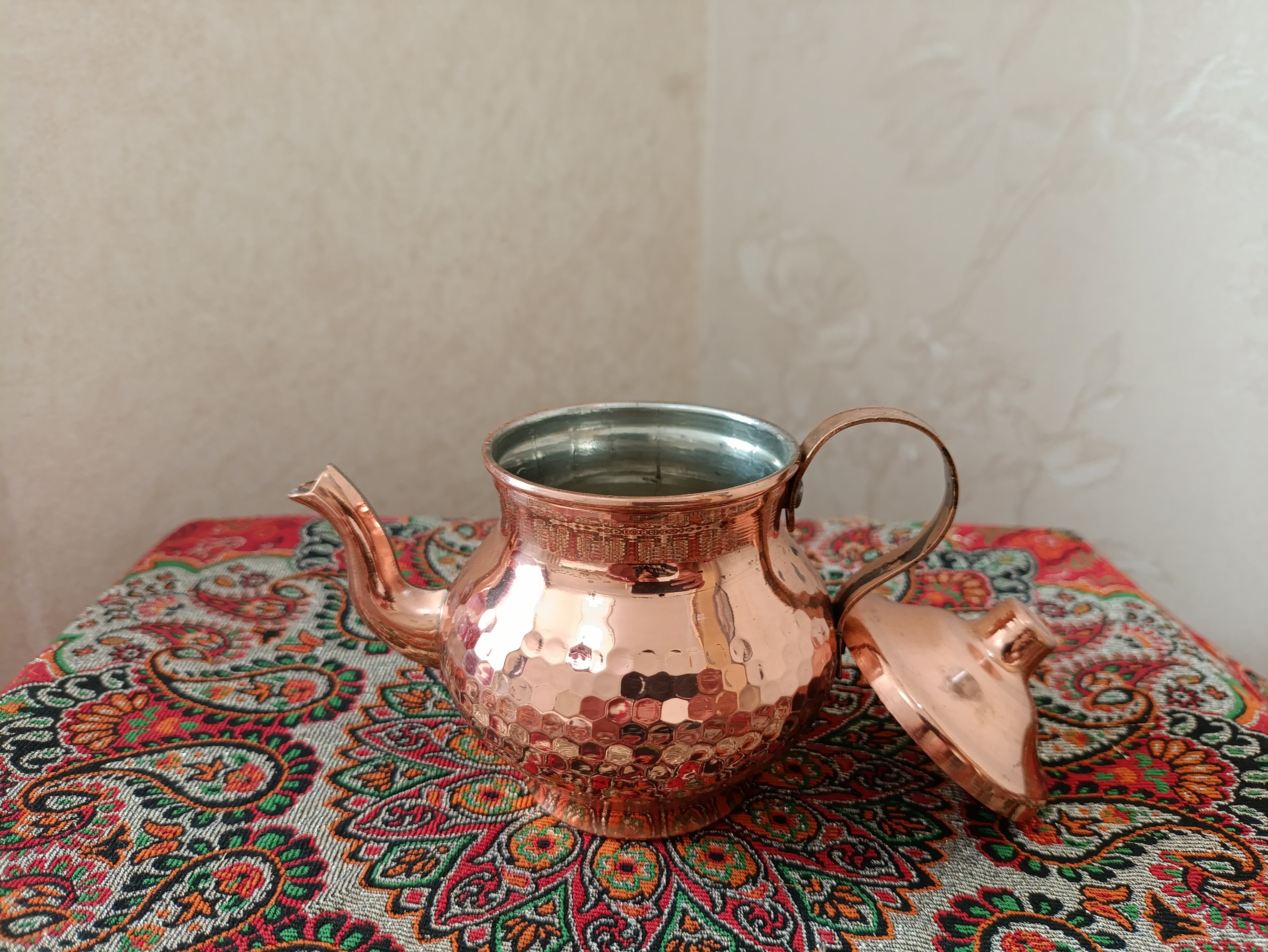 قوری مسی چکشی با گنجایش ۵۰ میلی لیتر مدل MZ01-B50 با قلع کاری داخل مناسب برای دم کردن زعفران دستساز زنجان