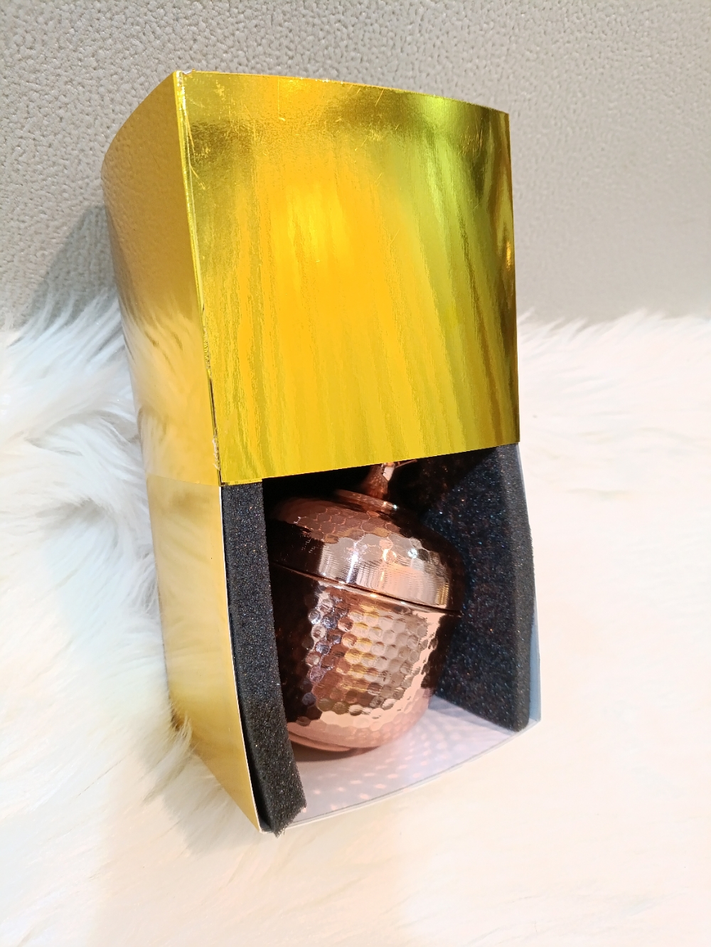 باکس: رنگ طلایی با فوم کاری داخل/ قندان: روکش داخل قلع، روکش بیرون مس نانو شده و رنگ ثابت