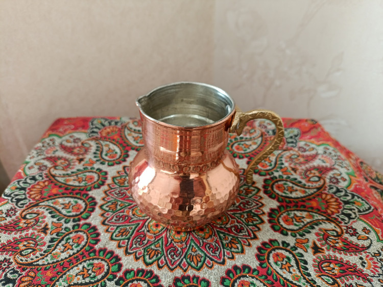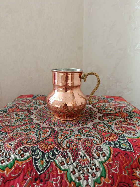 جام مسی چکشی با دسته برنجی و طرح کلاسیک مناسب برای مصرف انواع سس، آبلیمو و روغن زیتون دست‌ساز زنجان با قلع‌کاری داخل و روکش نانو