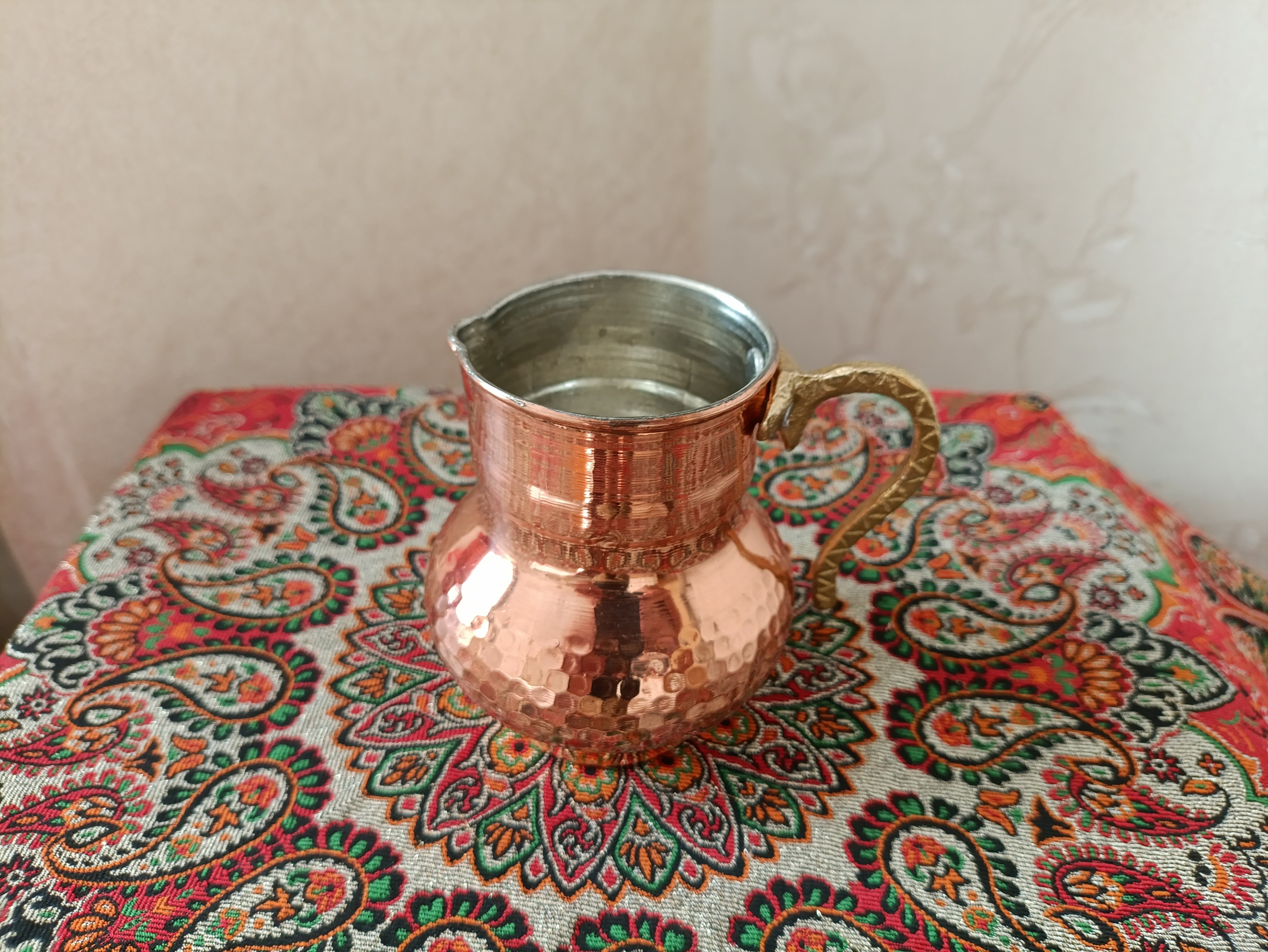 جام مسی چکشی با دسته برنجی و طرح کلاسیک مناسب برای مصرف انواع سس، آبلیمو و روغن زیتون دست‌ساز زنجان با قلع‌کاری داخل و روکش نانو