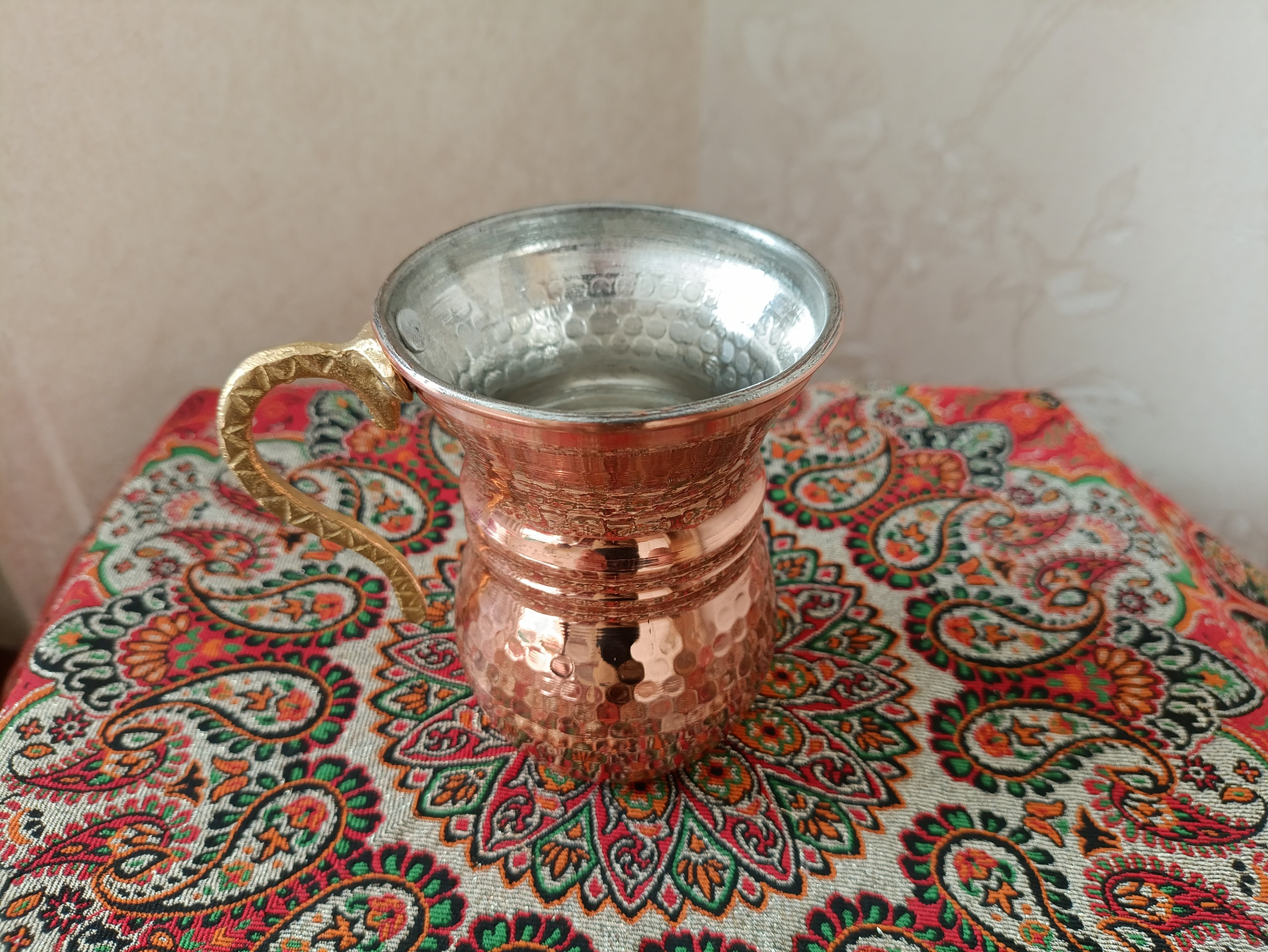 لیوان مسی چکشی تُرک با دسته برنجی مدل MZ26-TG مناسب برای مصرف انواع نوشیدنی های سرد با قلع کاری داخل و روکش نانو دستساز زنجان