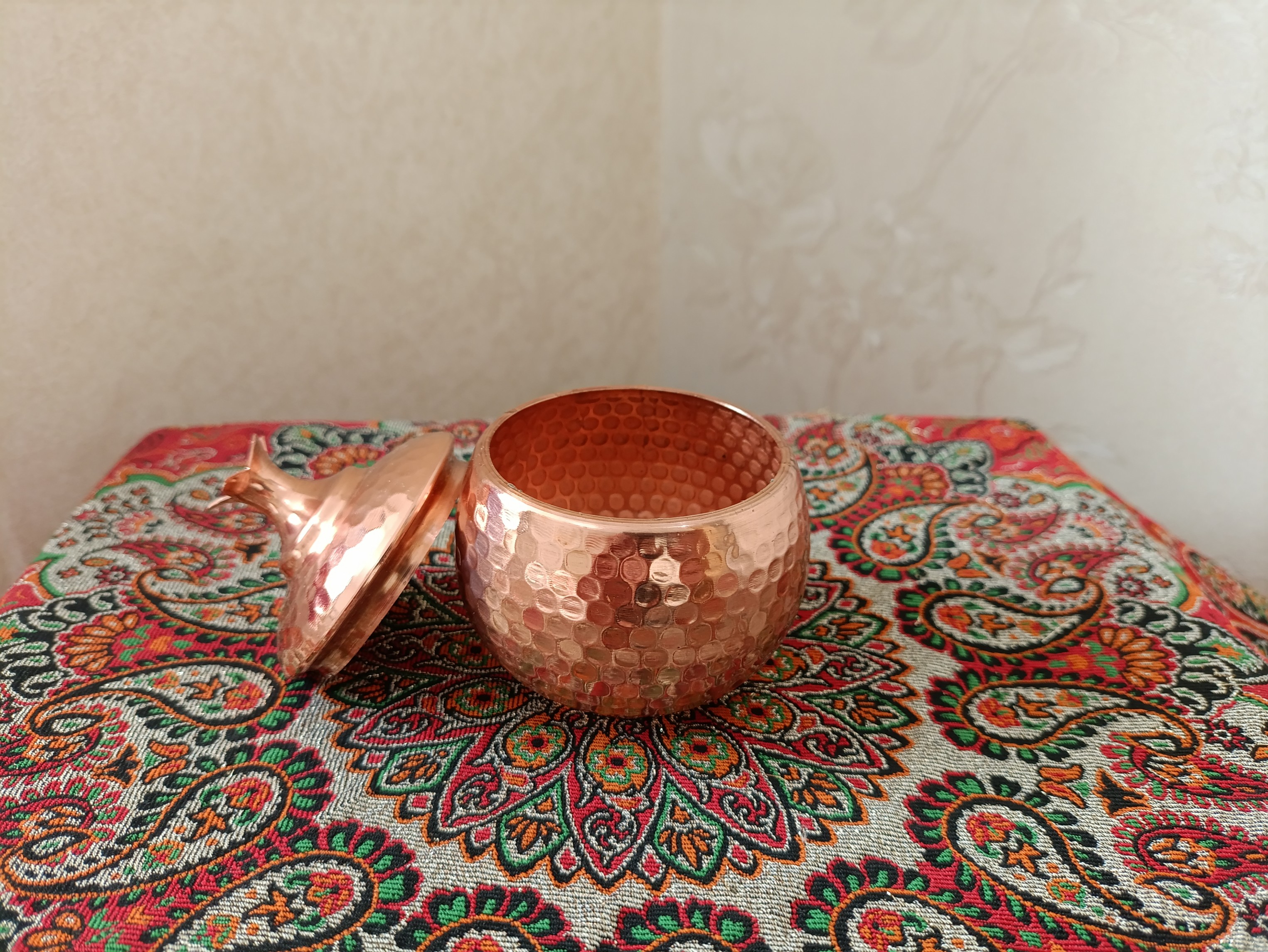 قندان مسی چکشی طرح انار مناسب برای مصرف قند، تنقلات و میوه خشک در شب یلدا با قلع کاری داخل و روکش نانو دست ساز زنجان
