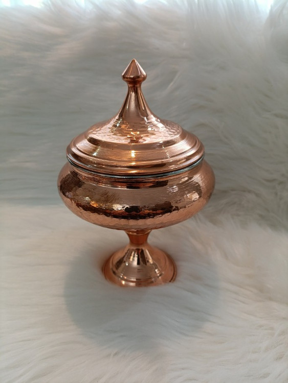 قندان مسی با طراحی لیزری طرح کلاسیک (پایه دار) مناسب برای مصرف قند، تنقلات و میوه خشک دست ساز زنجان با قلع کاری داخل و روکش نانو