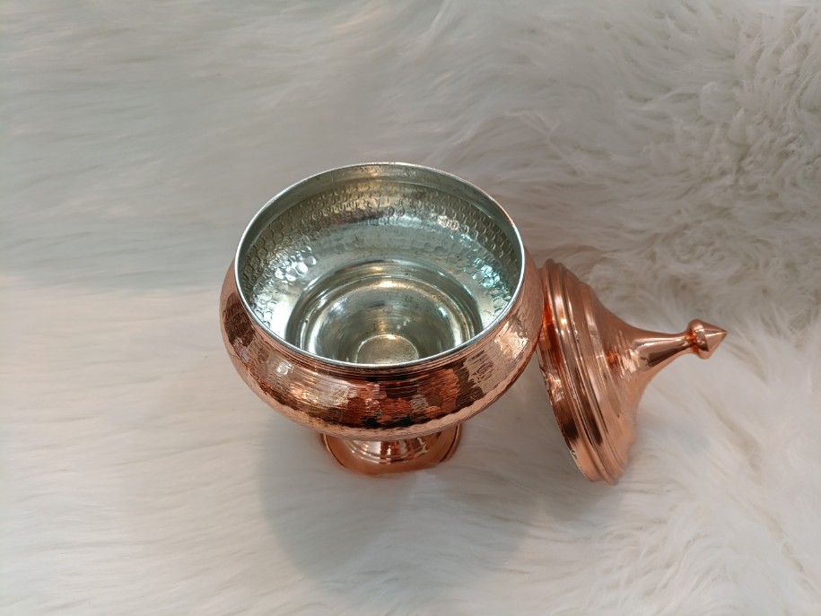 قندان مسی با طراحی لیزری طرح کلاسیک (پایه دار) مناسب برای مصرف قند، تنقلات و میوه خشک دست ساز زنجان با قلع کاری داخل و روکش نانو