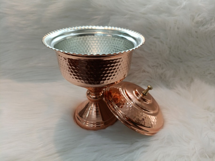 شکلات خوری مسی چکشی پایه دار مناسب برای مصرف شکلات، آجیل، میوه خشک و تنقلات دست ساز زنجان با قلع کاری داخل و روکش نانو