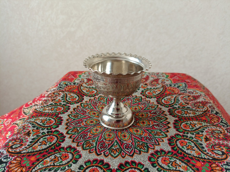جام مسی با طراحی لیزری مناسب برای استفاده در سفره عقد و سفره هفت سین دست ساز زنجان با روکش آبکاری کروم