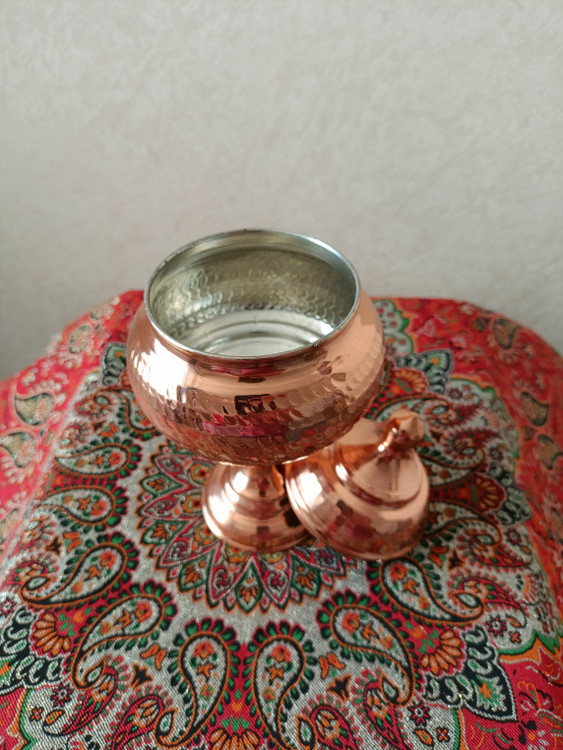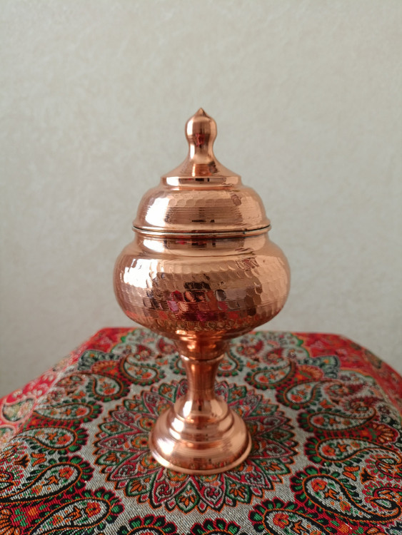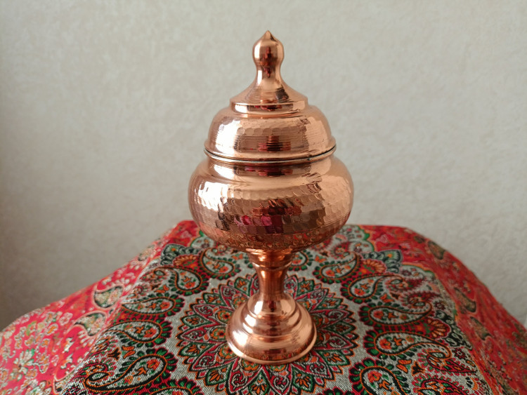 قندان مسی چکشی طرح گنبدی پایه دار مناسب برای مصرف قند، تنقلات و میوه خشک دست ساز زنجان با قلع کاری داخل و روکش نانو