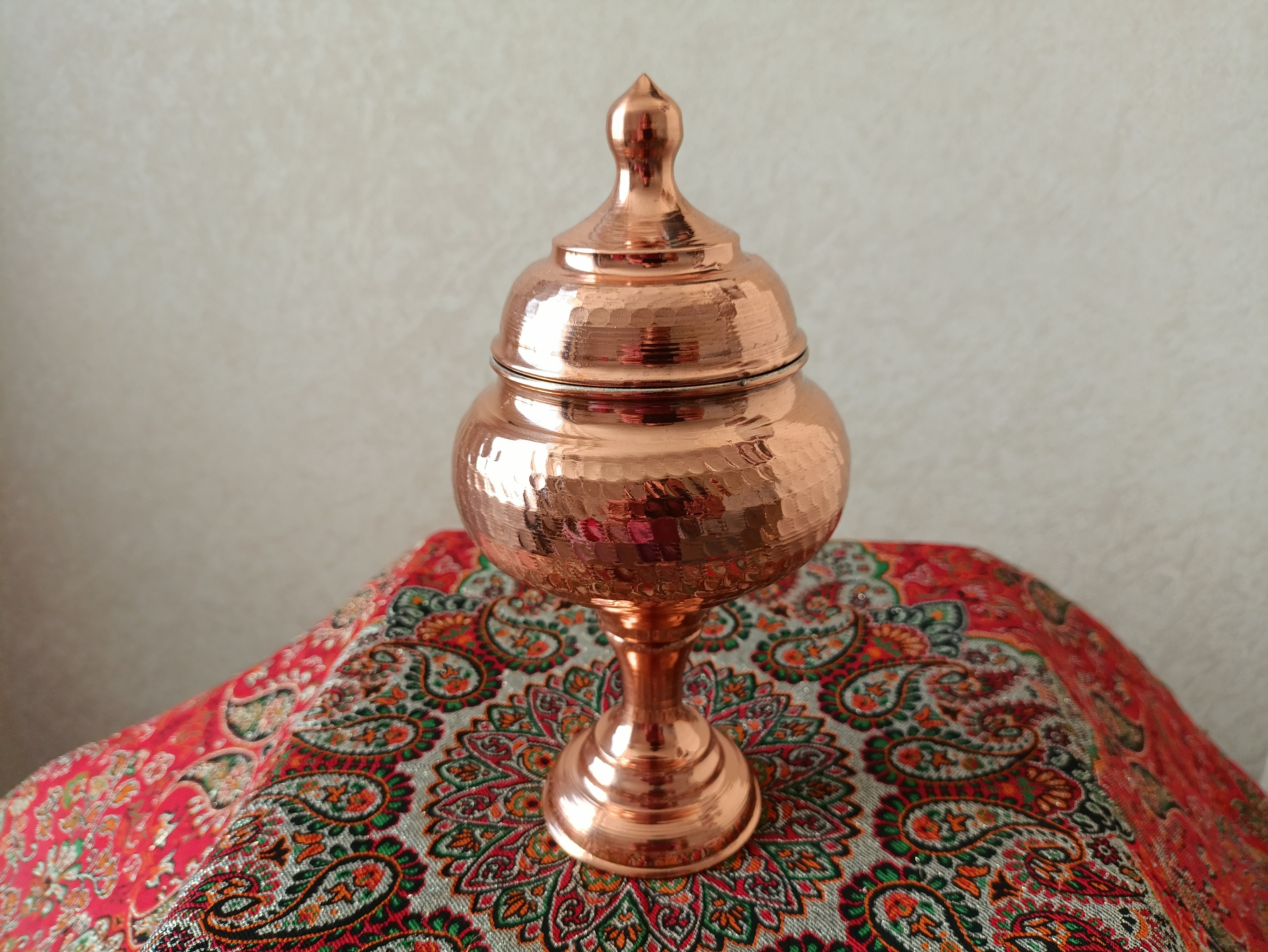 قندان مسی چکشی طرح گنبدی پایه دار مناسب برای مصرف قند، تنقلات و میوه خشک دست ساز زنجان با قلع کاری داخل و روکش نانو